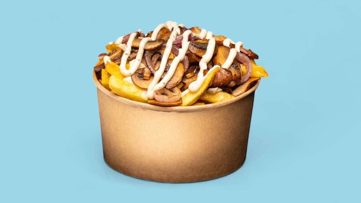 with French fries, truffle mayonnaise, braised onions and champignons