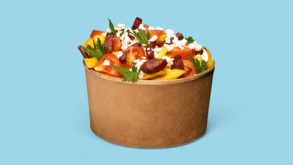 with French fries, tomatoes, cheese, beef sucuk and chili cheese sauce