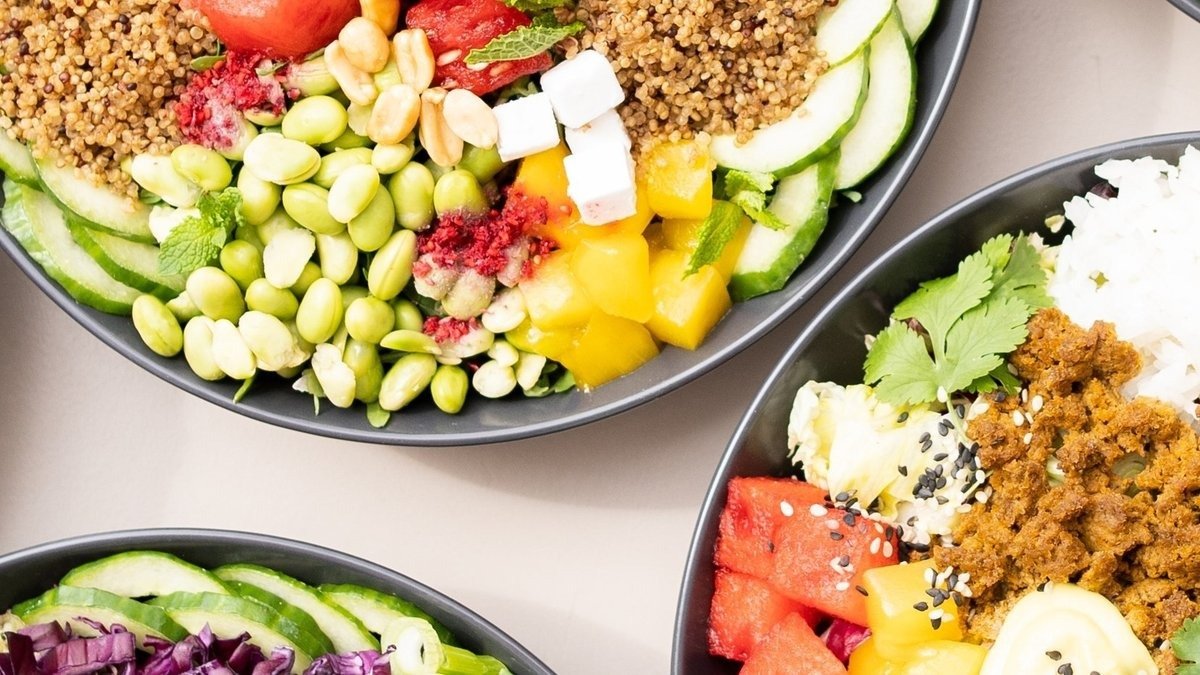 with glass noodles, smoked tofu, edamame, cherry tomatoes, cucumbers, red cabbage, fresh jasmine rice, crunchy lettuce, peanuts, coriander and sesame