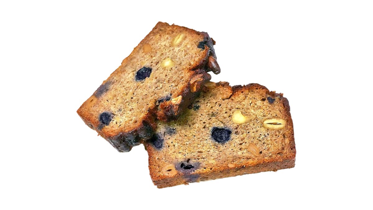 Homemade banana bread, made with wholemeal spelt flour and sweetened only with agave syrup. Aromatic blueberries meet crunchy cashews, oat flakes and cinnamon.