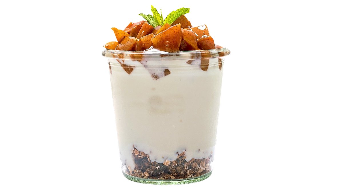 Crunchy granola meets soy yoghurt and wintery apple and cinnamon compote.