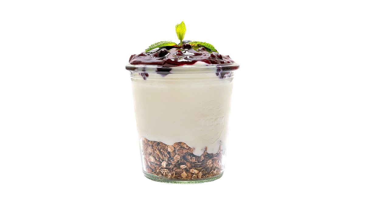 Crunchy granola meets soy yoghurt and wintery wild berry compote.