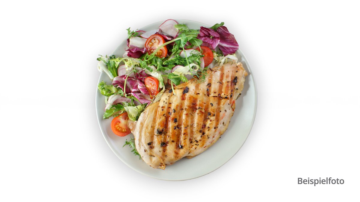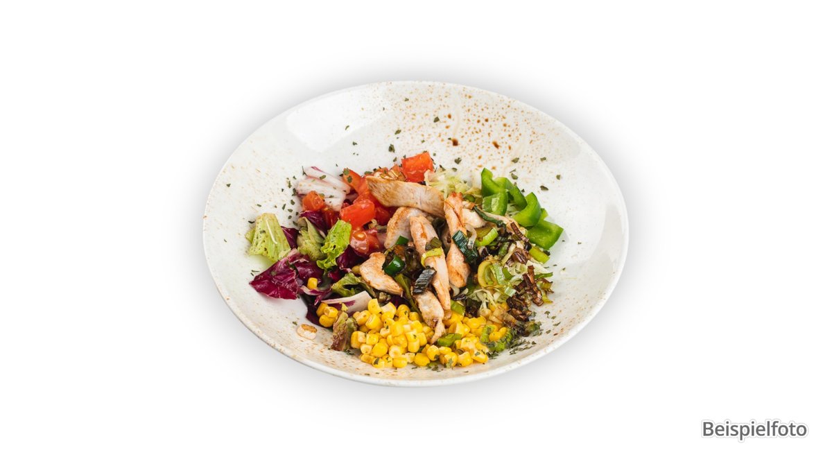 mixed salad with chicken breast, onions, cheese, egg and olives