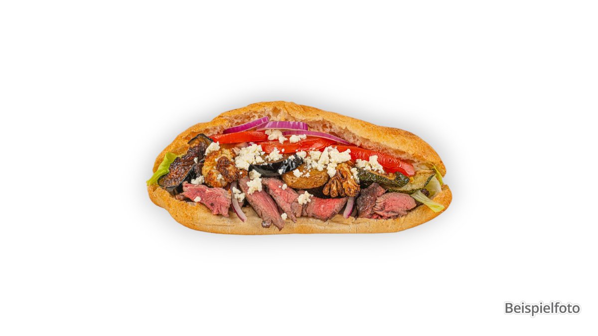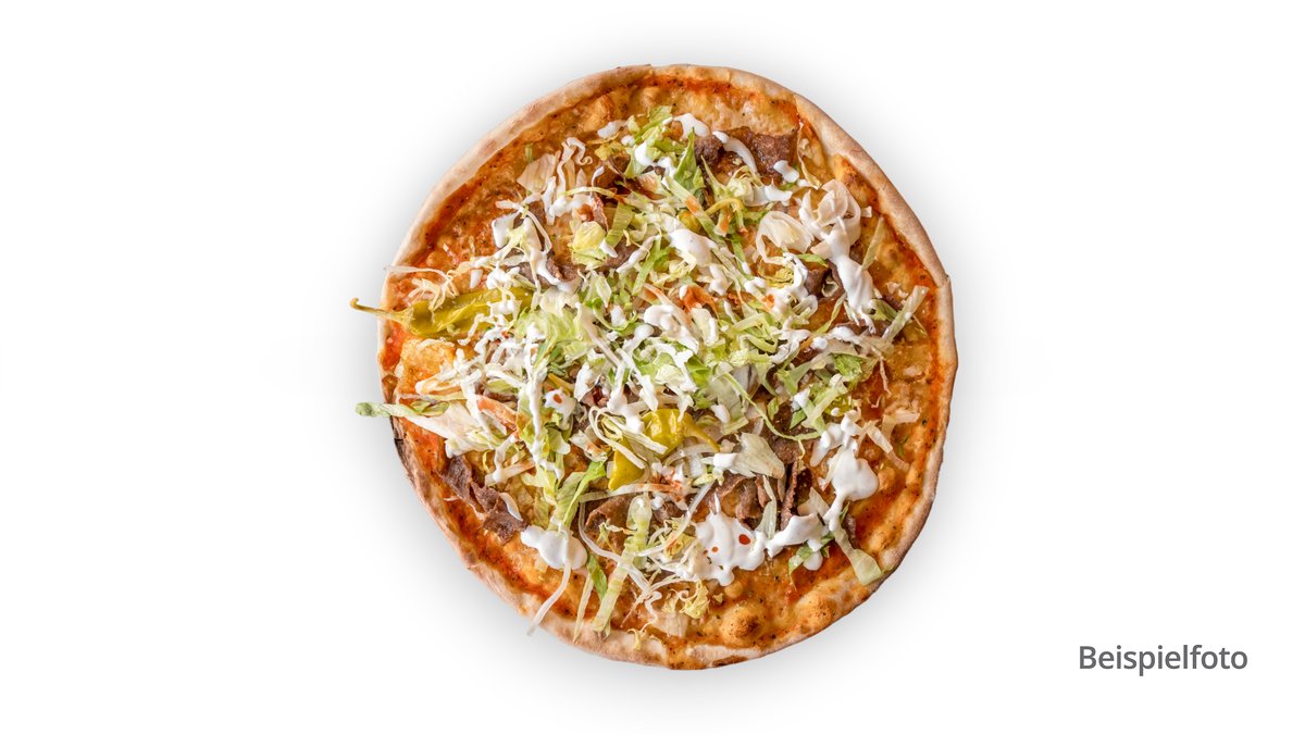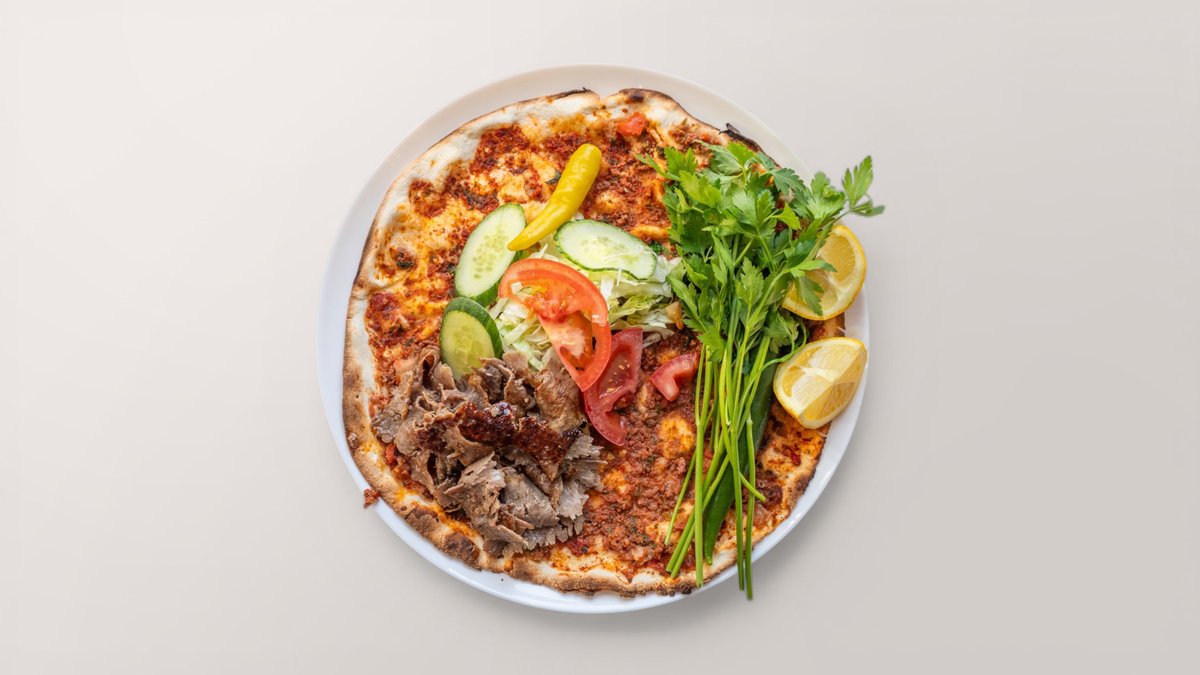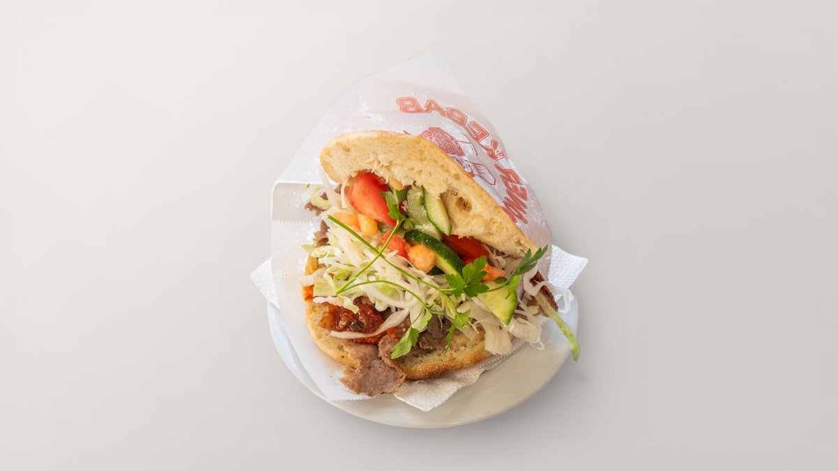 döner on toasted flatbread with garlic, yoghurt and special sauce