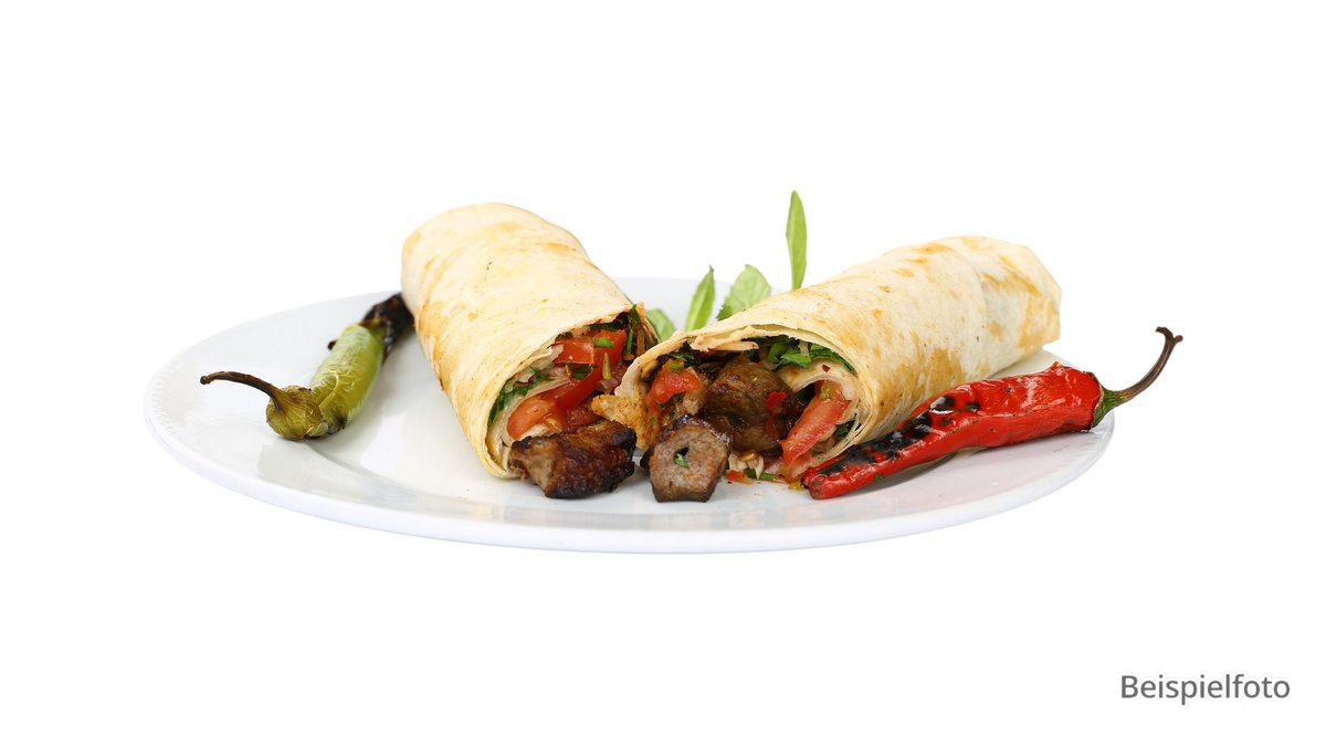 small pieces of sliced meat with tzatziki rolled up in thin flatbread