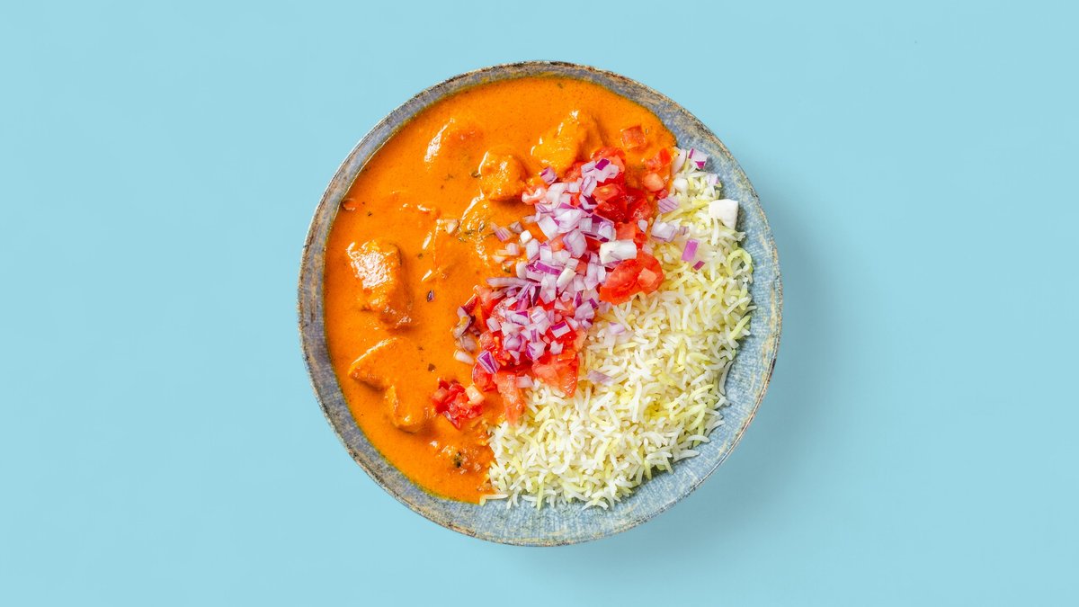mild Hähnchenfleisch in indischer Tomaten-Sahnesoße mit Reis