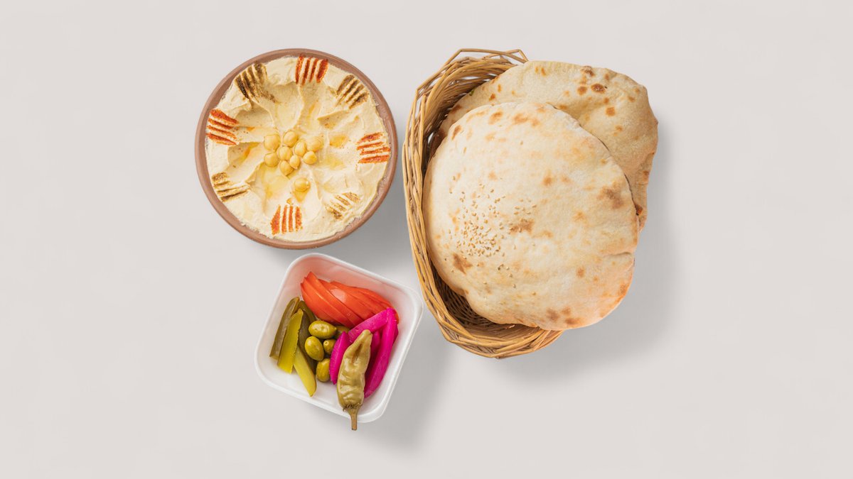 Kichererbsenpüree mit Tahina, Joghurt, Olivenöl, Brot, eingelegte Tomaten und Oliven