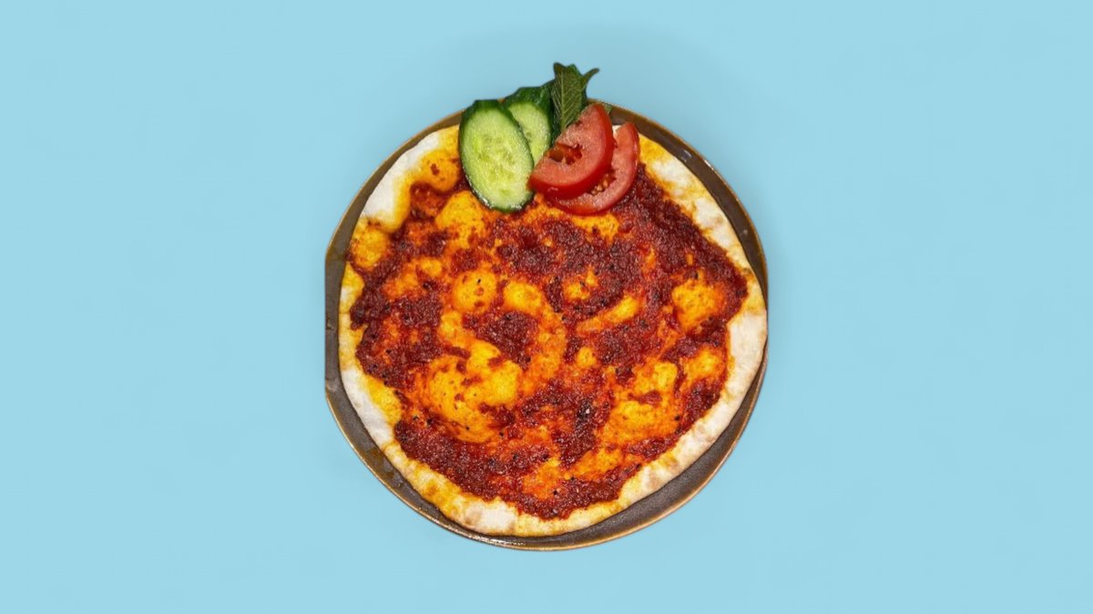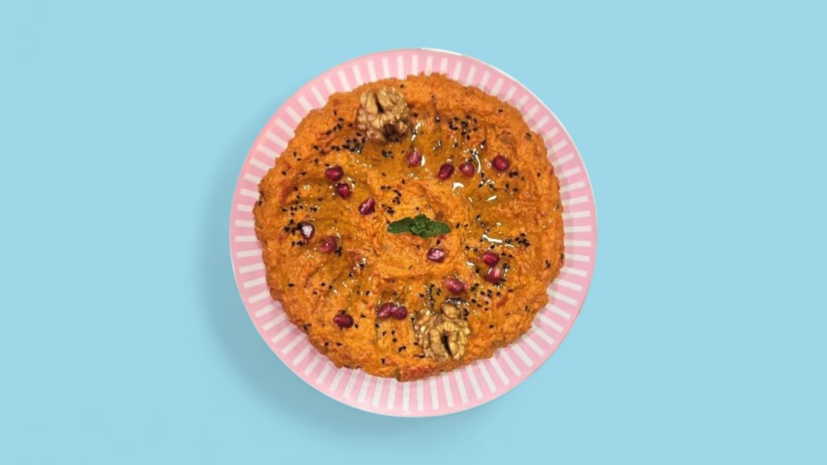 with tomato and bell pepper dip, sesame seeds, and black cumin