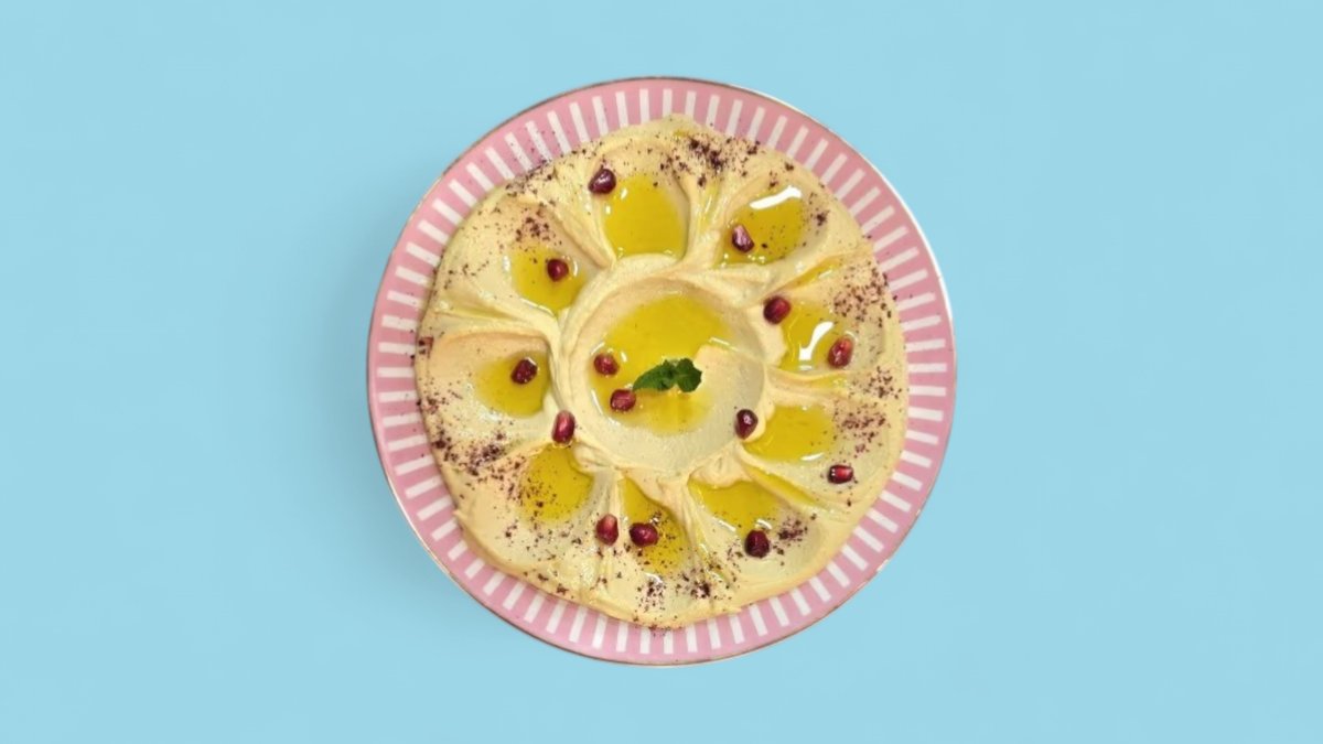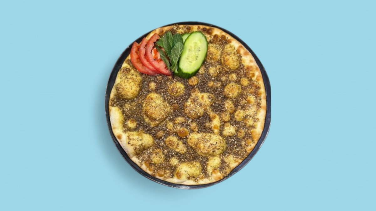 with wild herbs, cucumbers, tomatoes, pomegranate sauce, olives, and fried bread