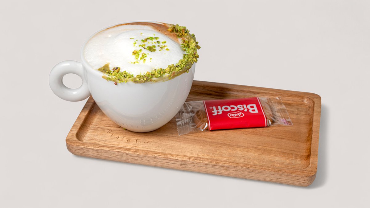 Heißes Kaffeegetränk mit Pistazie und Milch. Koffeinhaltig, enthält Milch, enthält Pistazien.