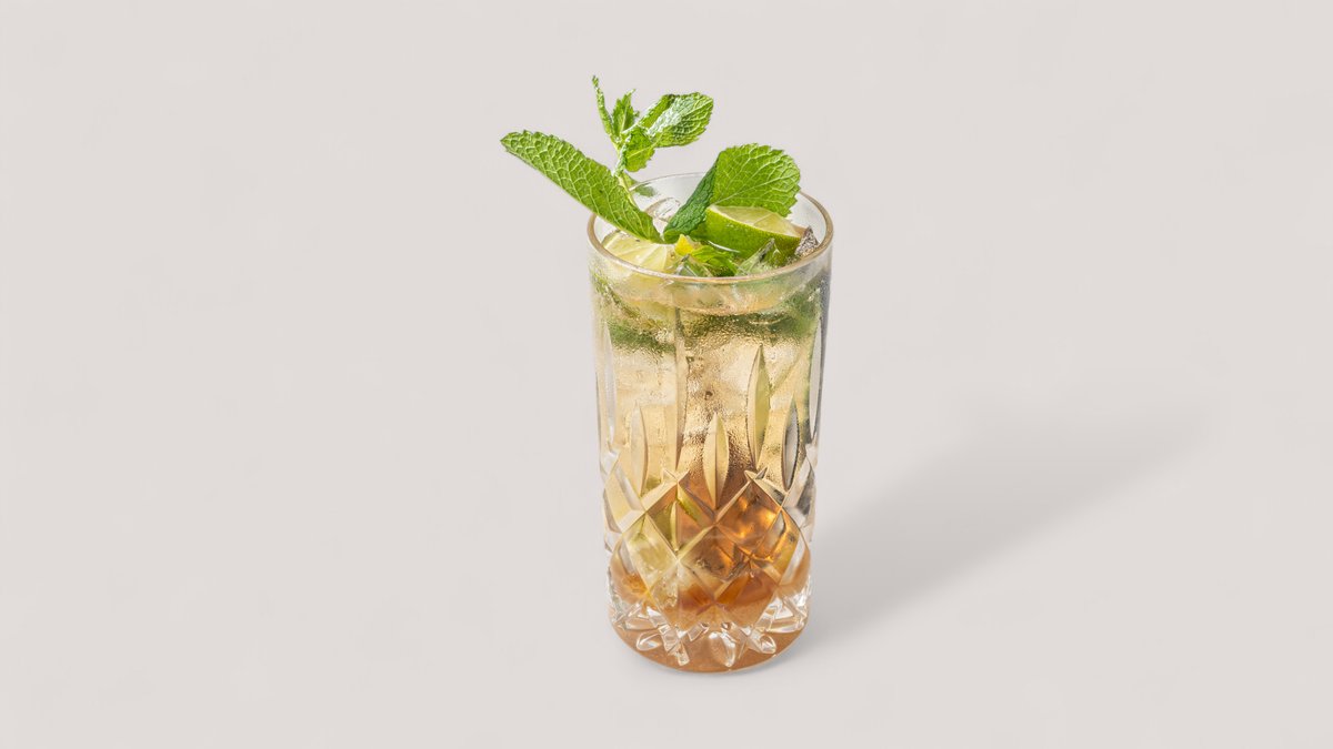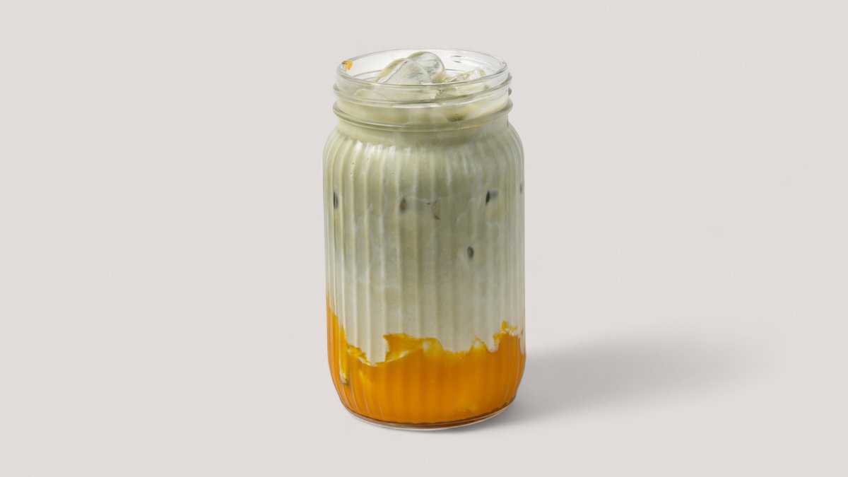 Kaltes Getränk mit Matcha und Mango. Koffeinhaltig.