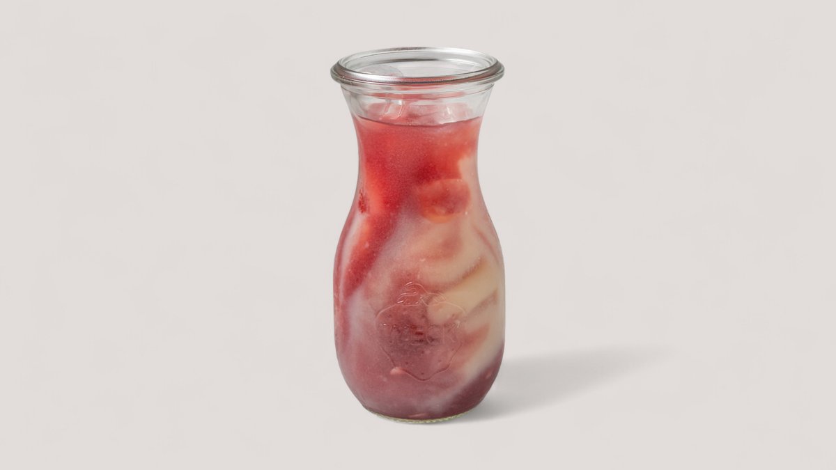 Kaltes Getränk mit Matcha und Erdbeere. Koffeinhaltig.
