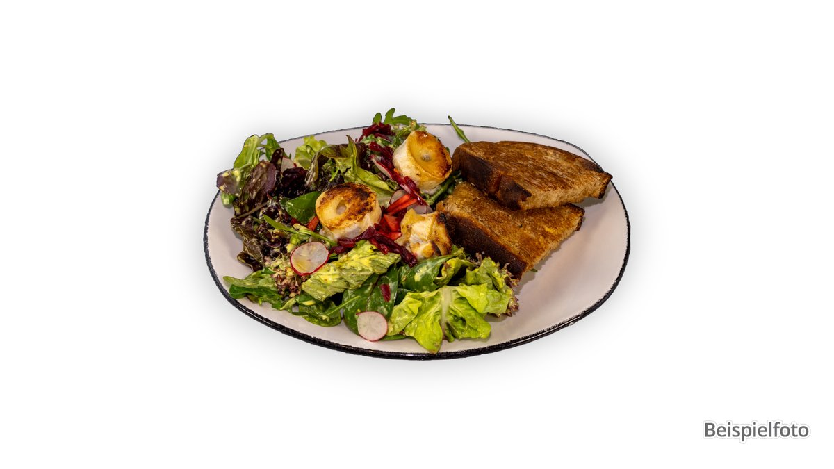 Salat-Mix mit Rucola, Paprika, Kirschtomaten, Gurken, Möhren und karamellisiertem Ziegenkäse