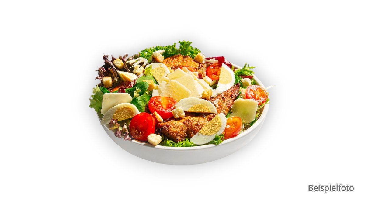 Salat-Mix mit Paprika, Hähnchenfilet, Kirschtomaten, Parmesan und Croutons