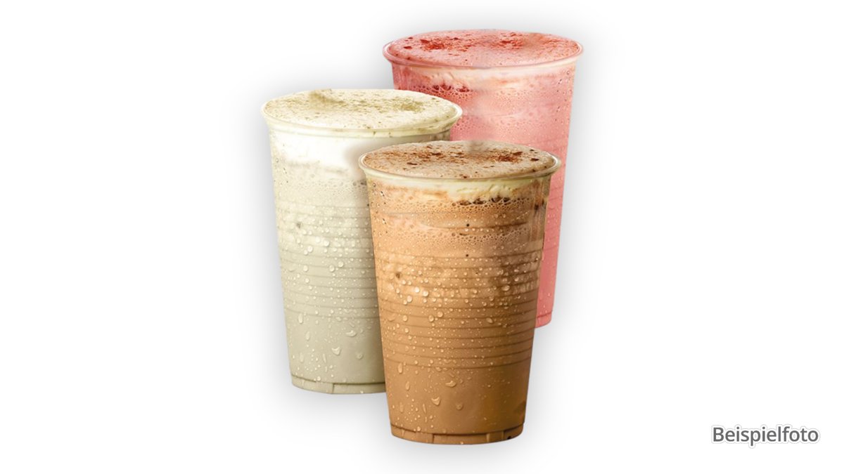 Kaltes Getränk mit Matcha, Vanille und Eis. Koffeinhaltig, enthält Milch.