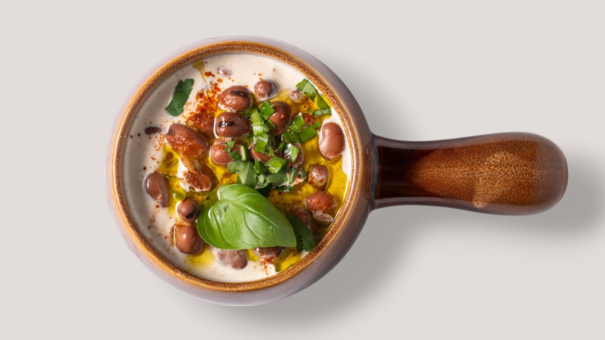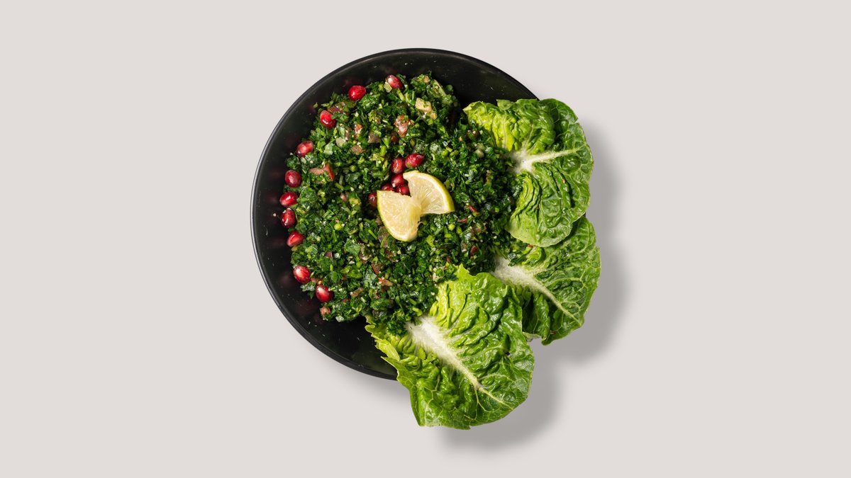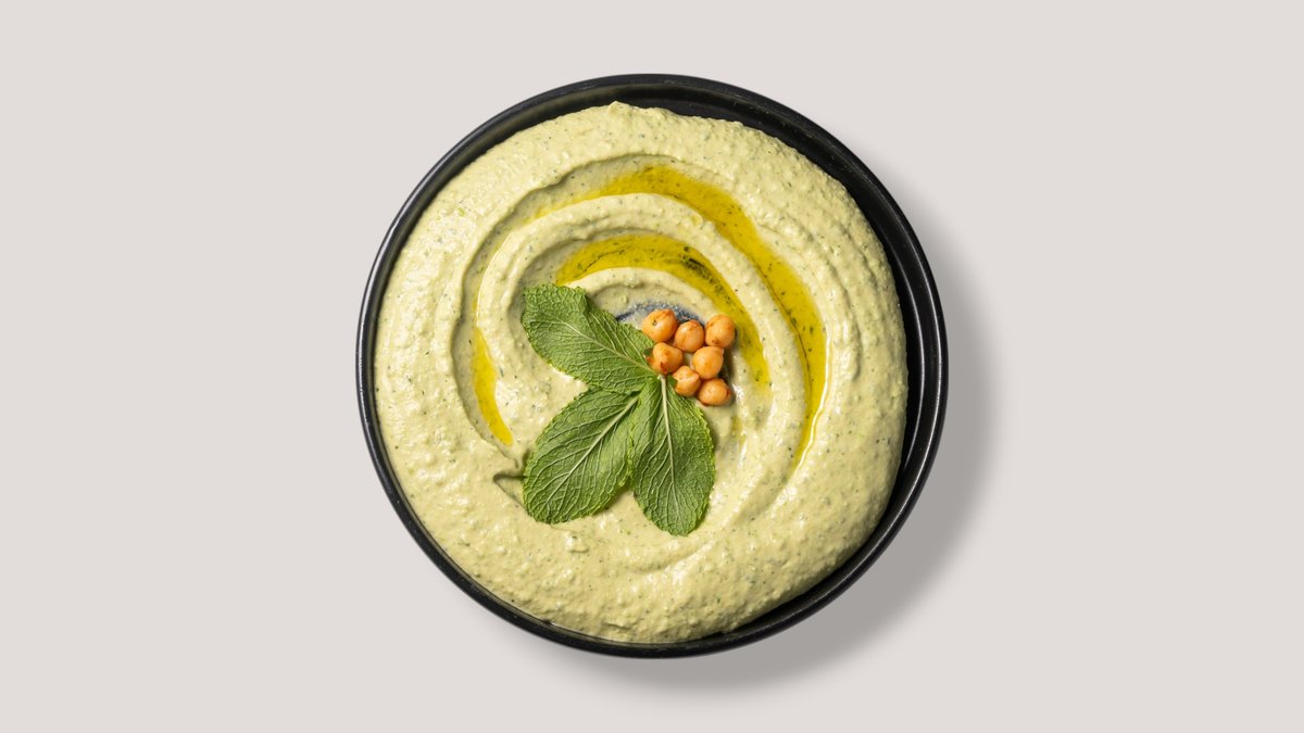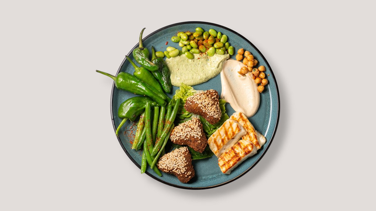 with falafel, halloumi, green bell peppers, edamame, hummus, green beans and mint-lemon juice