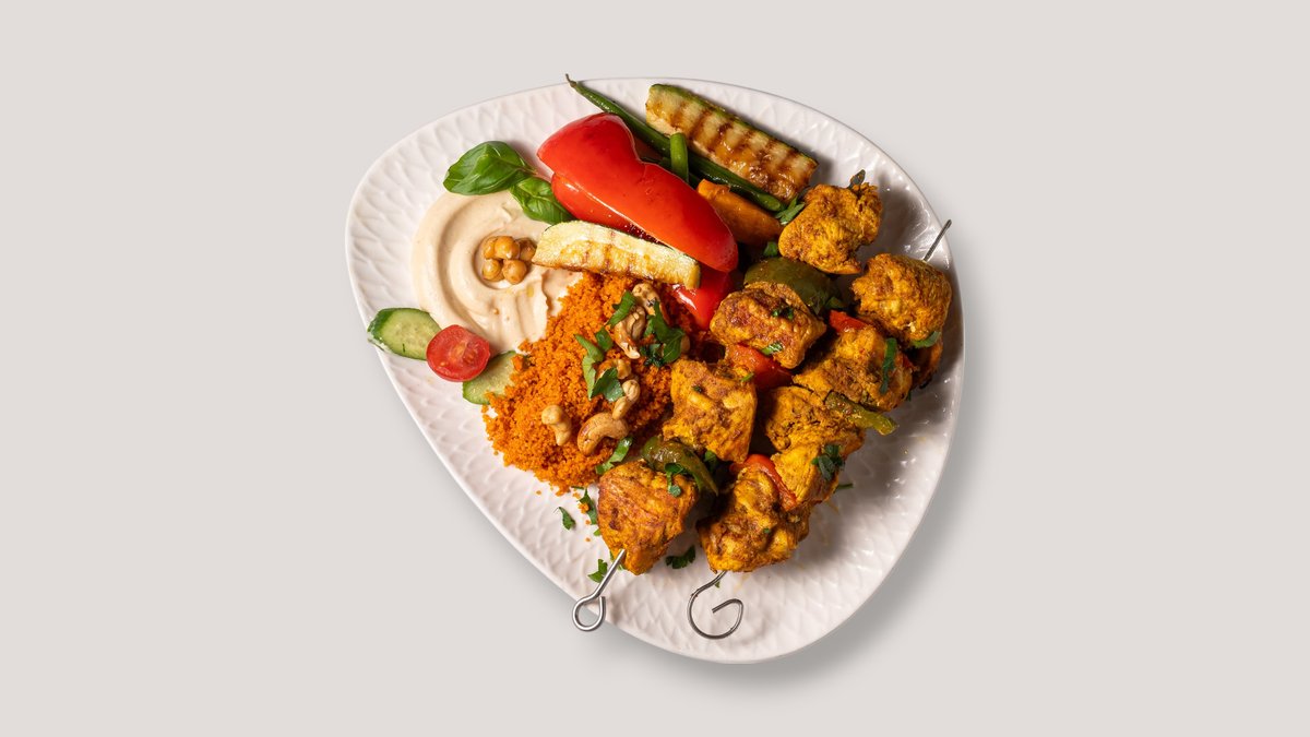with chicken skewers, mixed vegetables and a side dish of your choice