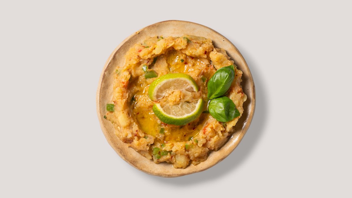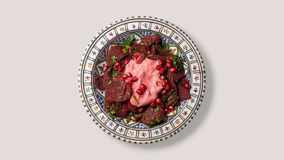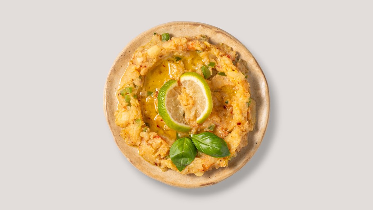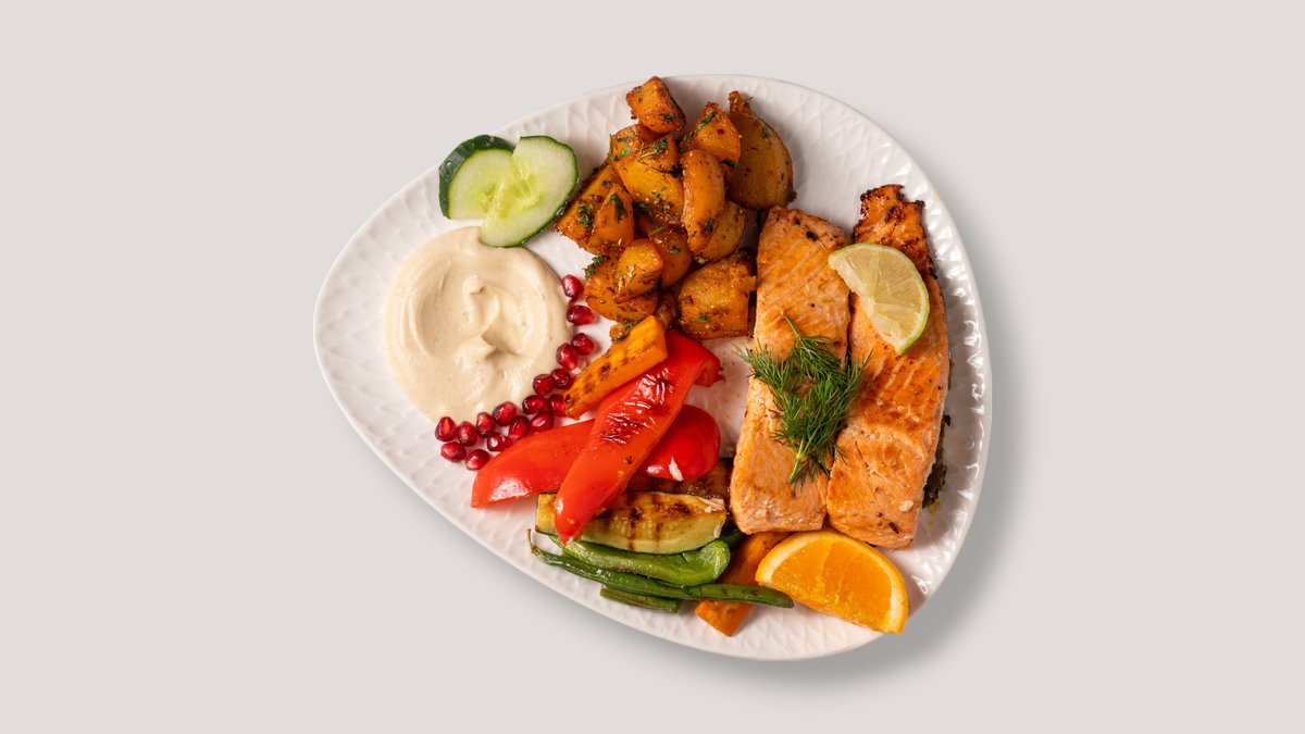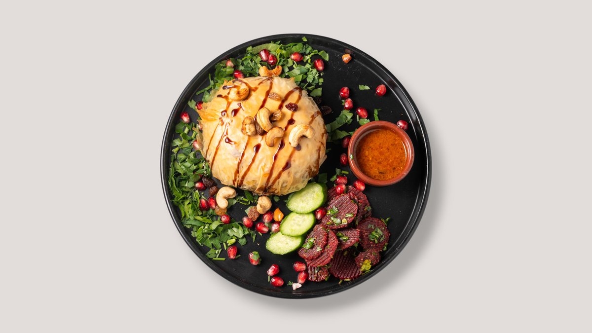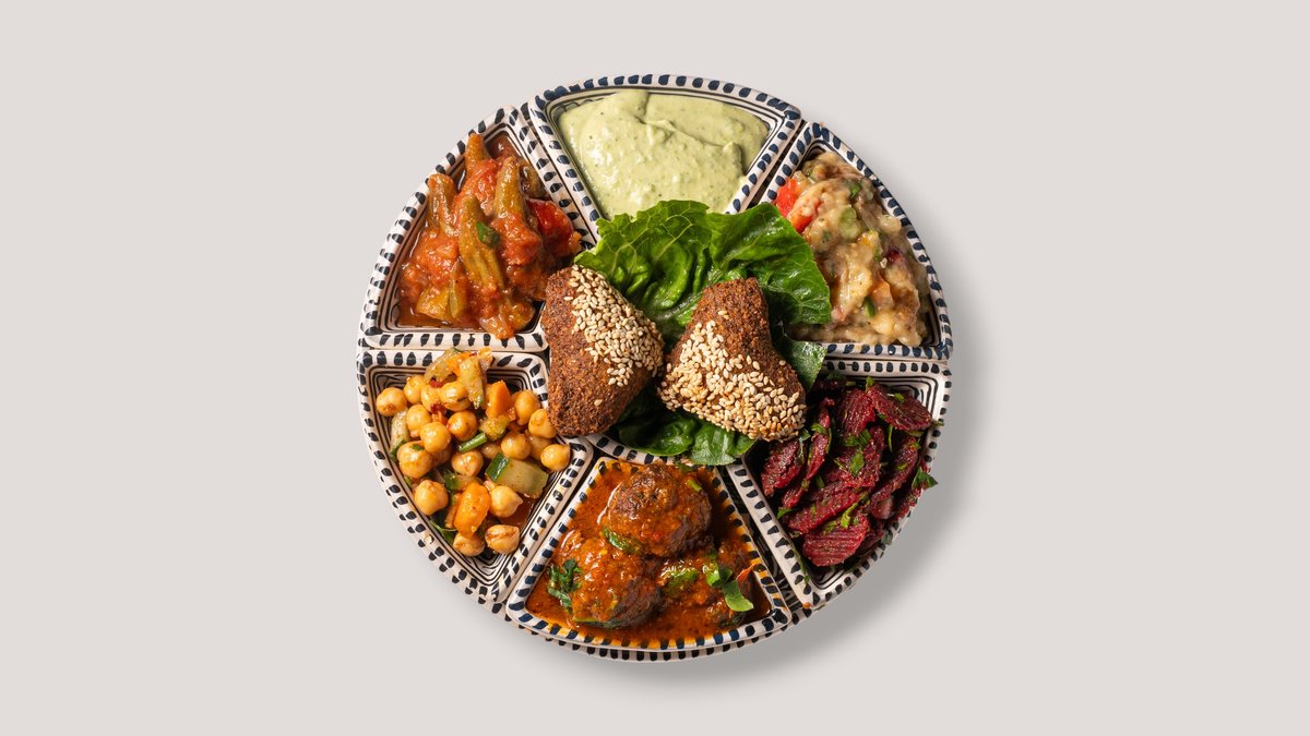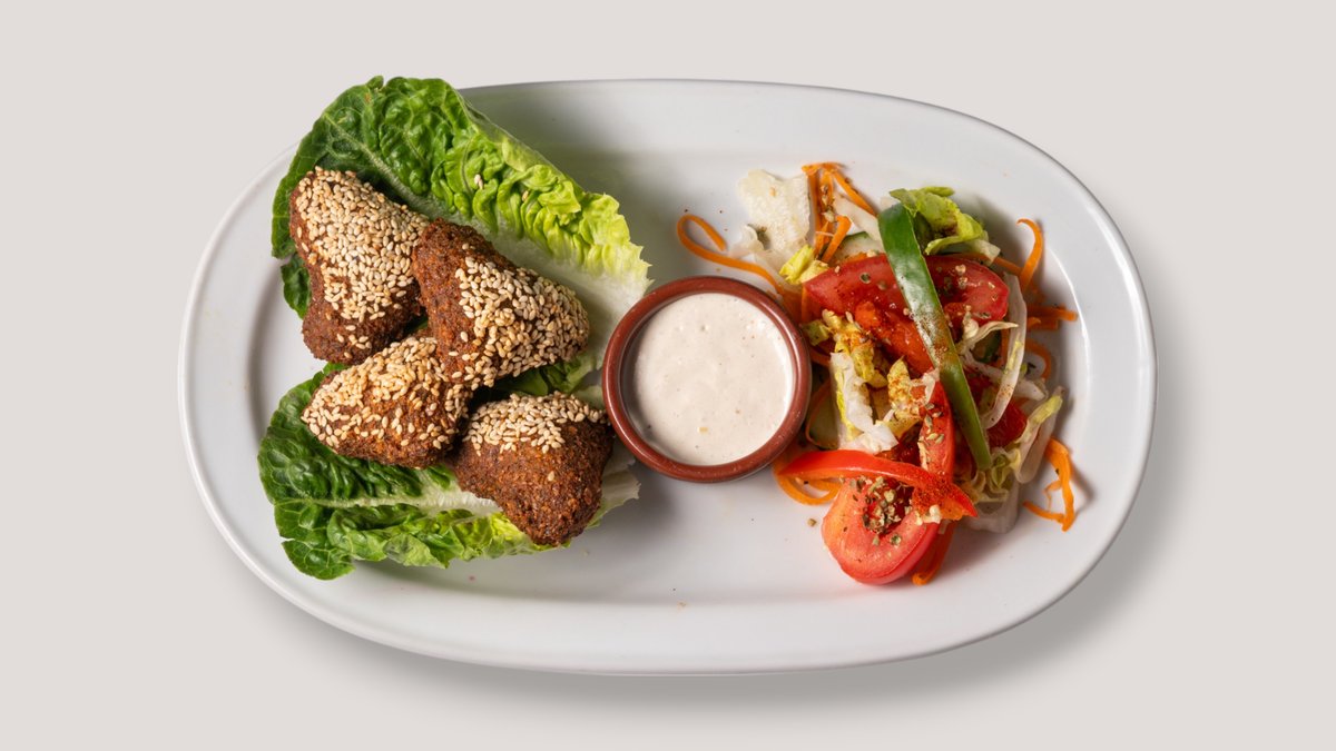 with crispy potato balls, falafel, colorful vegetables and hummus
