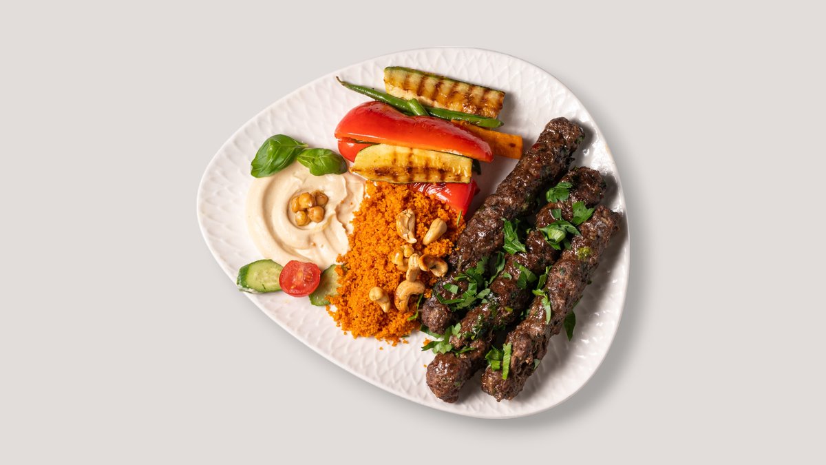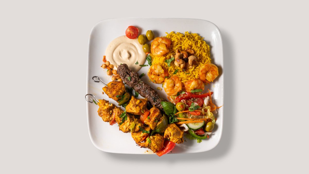 with chicken, kofta, prawns, hummus, side salad and a side dish of your choice