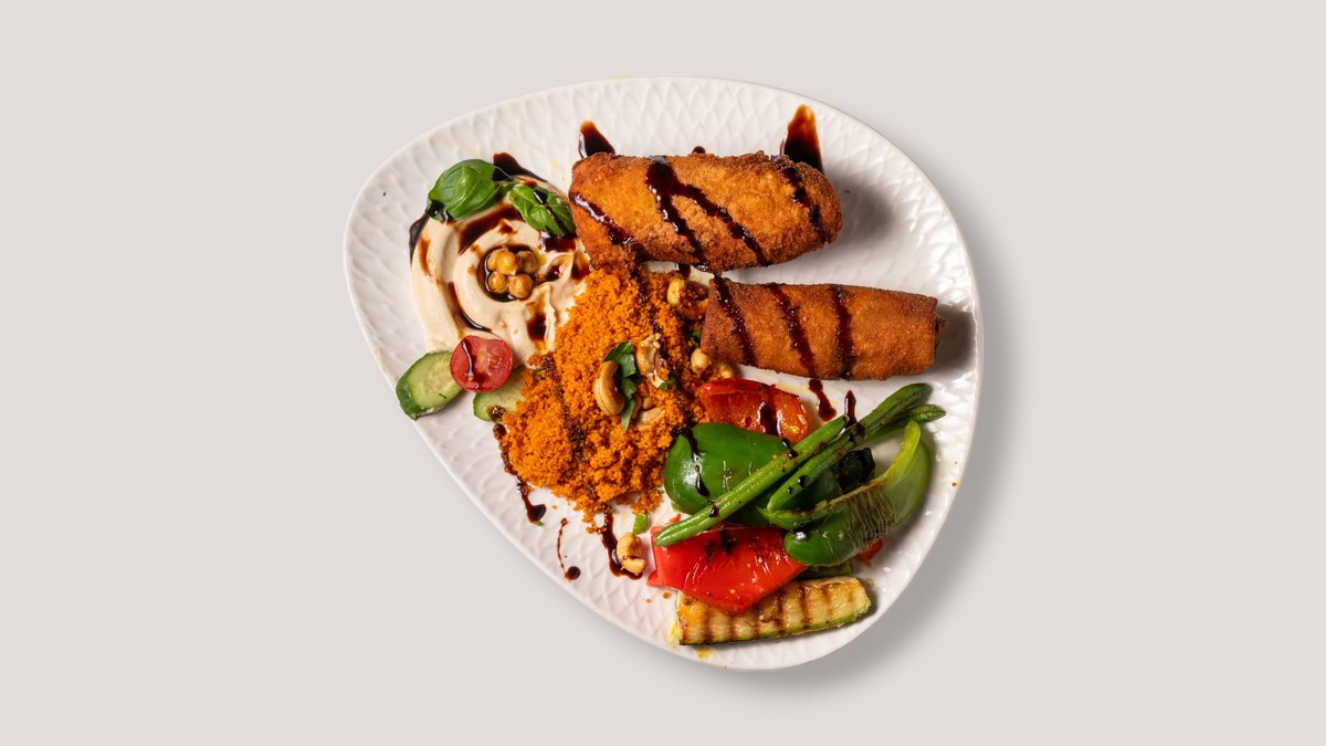 with crispy rolled chicken, colorful vegetables and a side dish of your choice