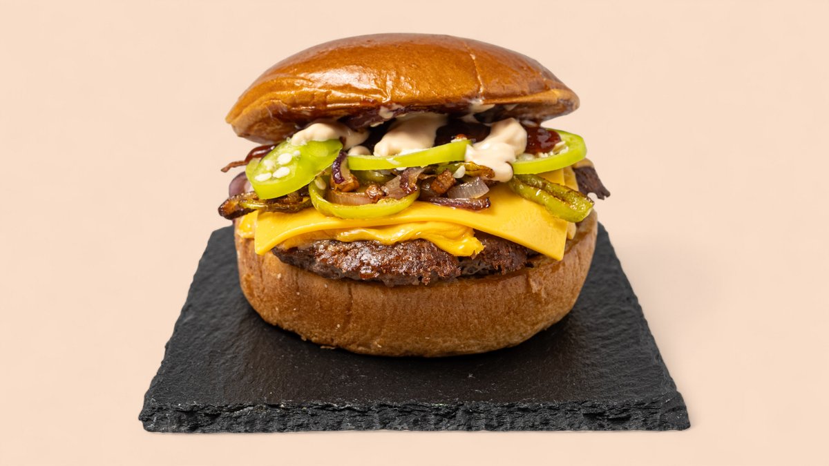 Cheeseburger mit Apfelholz, gerächertem Kalbsspeck, gehackter Kirschpaprika und haudgemachter Zoom Soße
