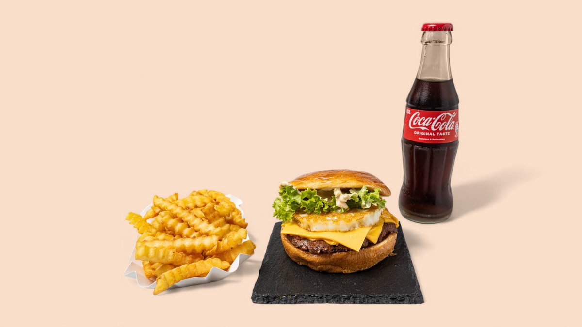 alle Menüs werden mit einem Burger, einer Beilage und einem Getränk deiner Wahl serviert