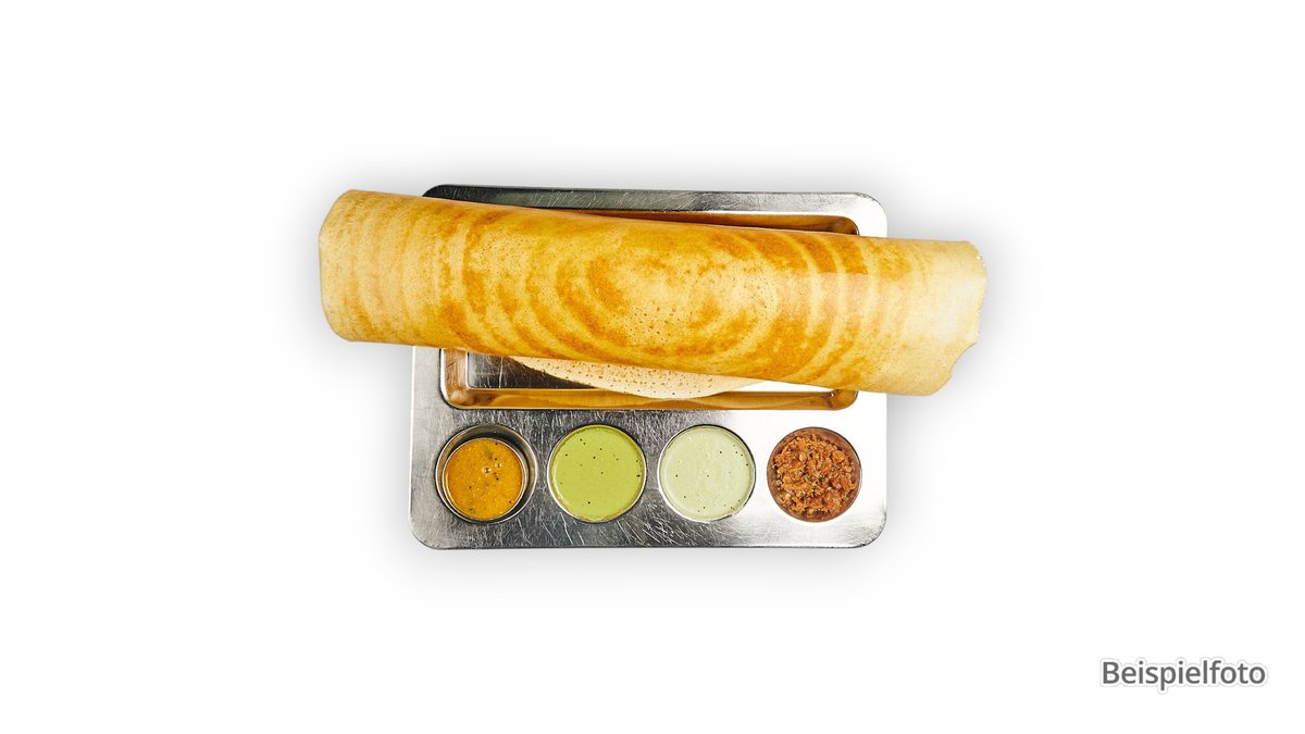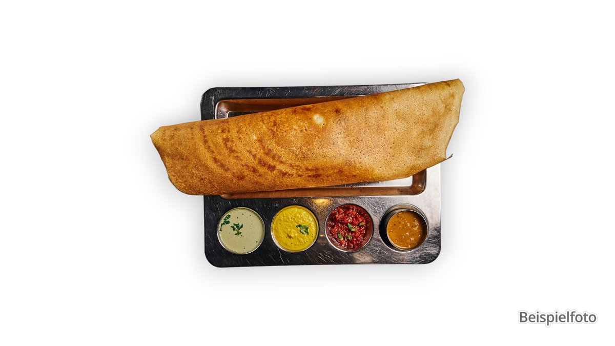 thin crepe made from rice and lentil paste with spiced potato curry, sambar, and coconut/peanut chutney