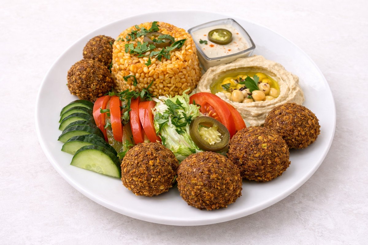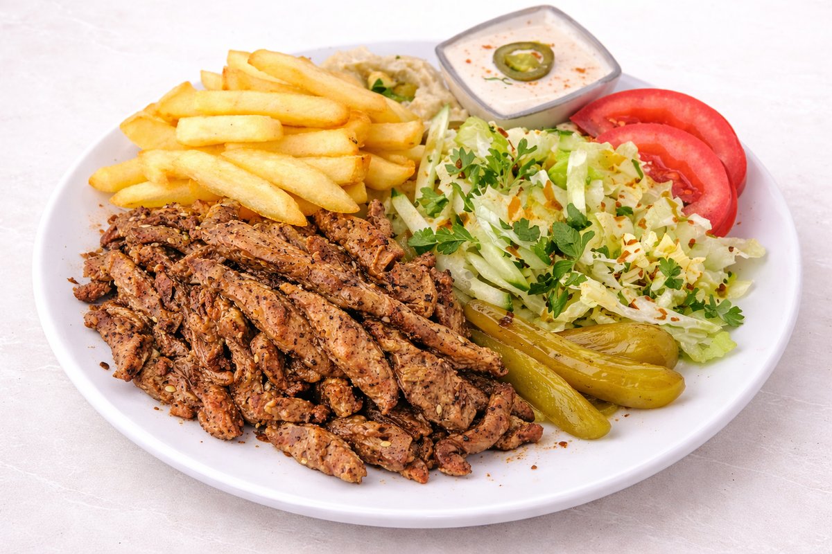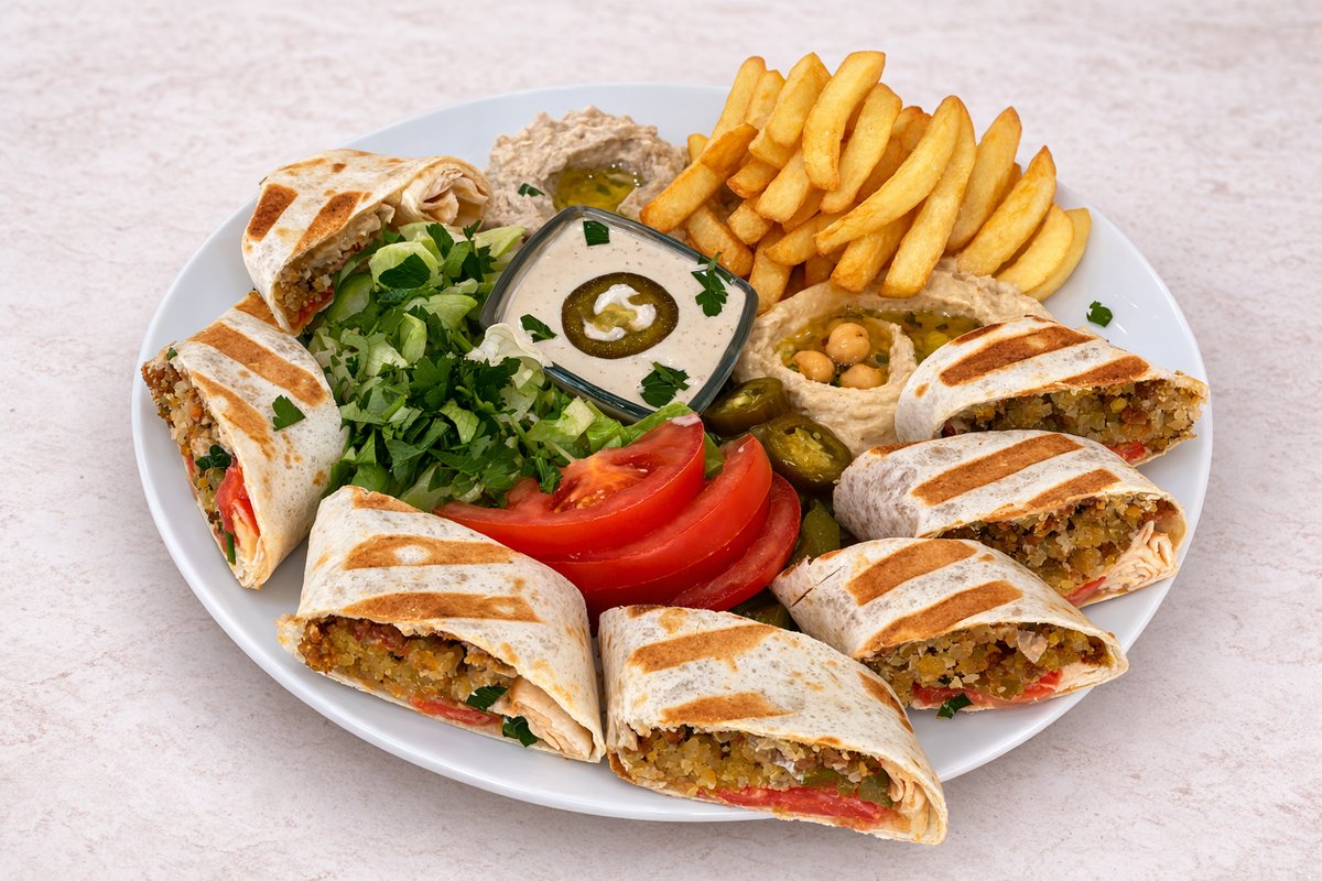 alle Gerichte werden mit WeiĂźkohlsalat, Eisbergsalat, Tomaten, frischen Gurken, eingelegten Gurken, Petersilie, GranatapfelsoĂźe und SesamsoĂźe serviert
