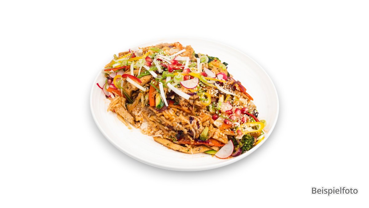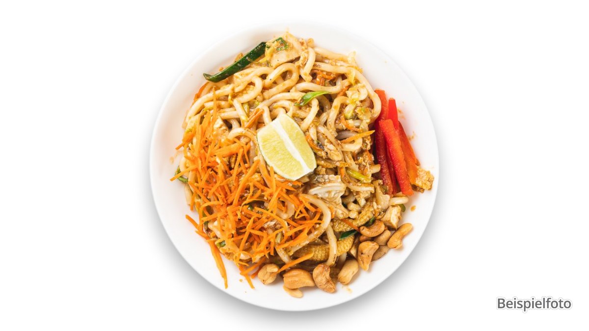 fried udon noodles with egg, fresh vegetables, salad, peanuts and fried onions