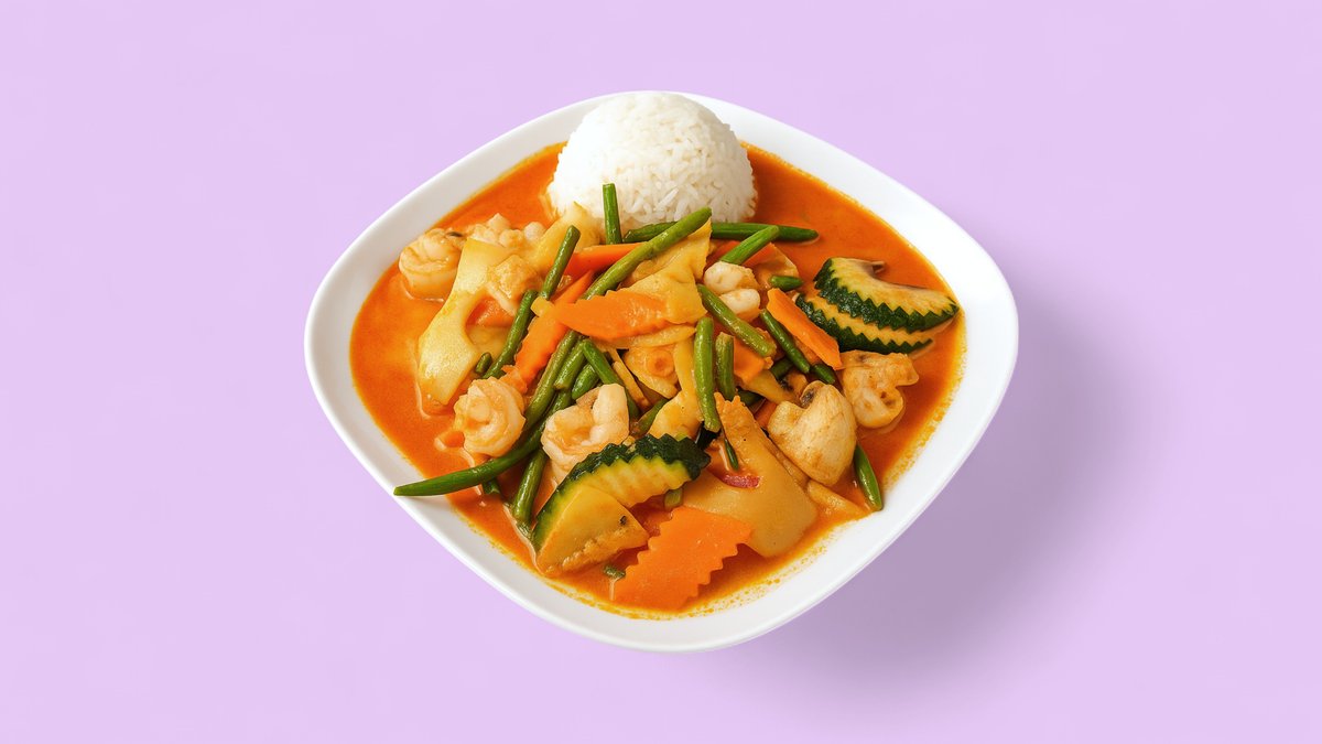 red curry with coconut milk, fresh vegetables, salad, peanuts and fragrant rice