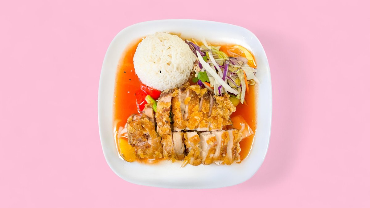 Fried chicken breast with lemongrass, chili, fresh vegetables, salad, spicy dark sauce and fragrant rice