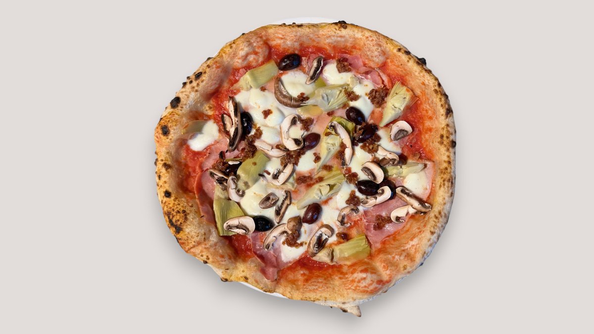 with tomato sauce, fior di latte mozzarella, artichokes, cooked ham, Kalamata olives, freshly sliced champignons and bacon oil