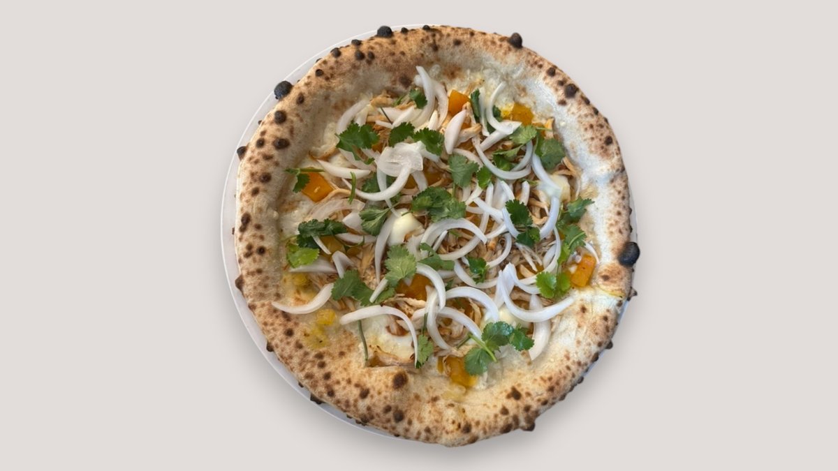 with provolone, mozzarella di bufala campana dop, papaya and onion jam, shoyu chicken breast, ginger, garlic, coriander, white onions and yuzu