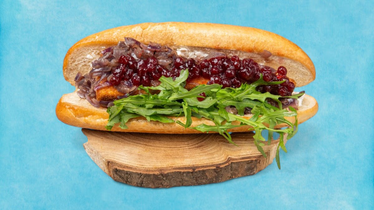 mit 160 g Kichererbsen-Patty, süßer Chili-Mayonnaise, Honig-Limetten-Krautsalat, mildem Chili-Käse, Brioche-Brötchen, grünem Chutney und Bhel-Nudel-Crunch