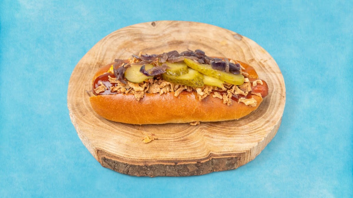 Authentic BBQ Wurst 100 % Rind und Schwein in Naturdarm mit Hot-Dog-Brötchen, MS-Gelbem Senf, Smokehouse-Ketchup, süß – sauer Gurkenscheiben und Röstzwiebeln