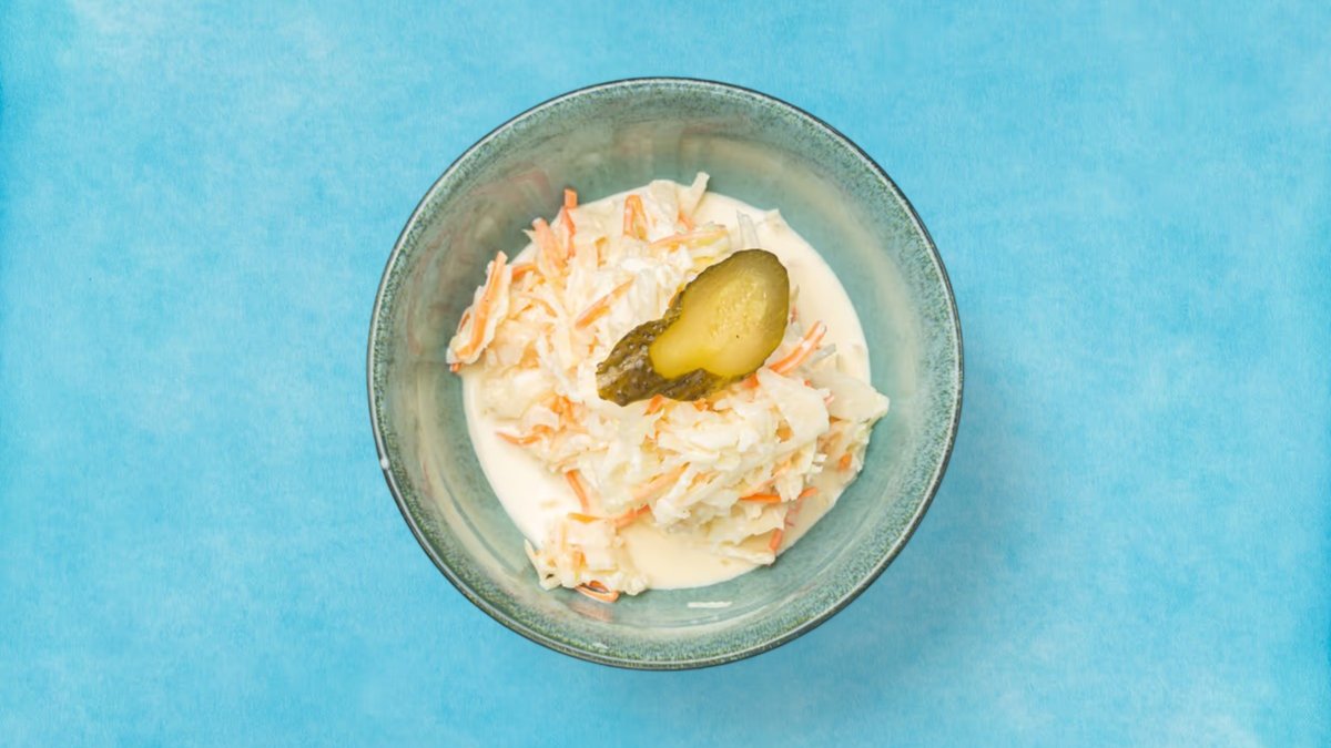 mit 100 g Pastrami vom Rind, Brioche Brötchen, karamellisiertem Sauerkraut, Chili-Mayonnaise, Käse, Gewürzgurken, roten Zwiebeln und Römersalat