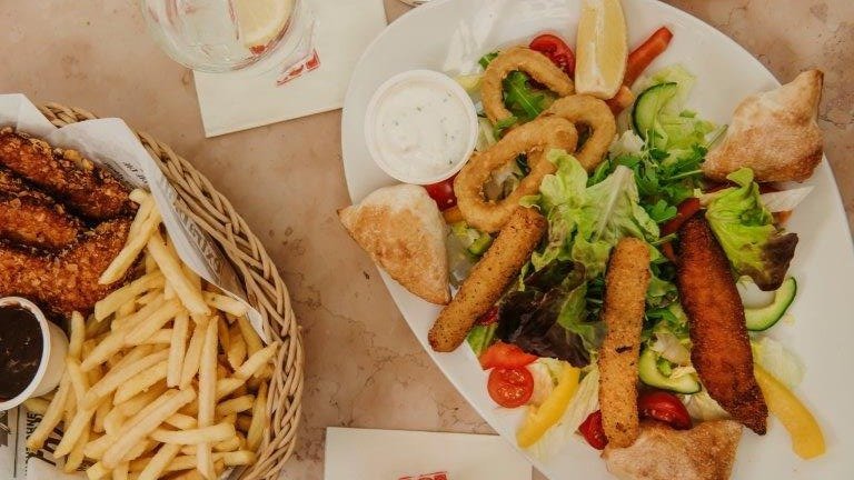 all salads are prepared with rocket, iceberg lettuce, cherry tomatoes, cucumbers and bell peppers and served with a dressing of your choice