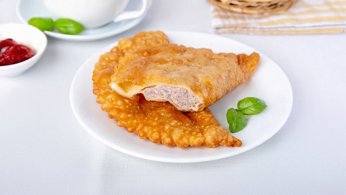 Tscheburek mit gewürztem Hackfleisch (Schwein/Rind) goldbraun in Öl frittert.