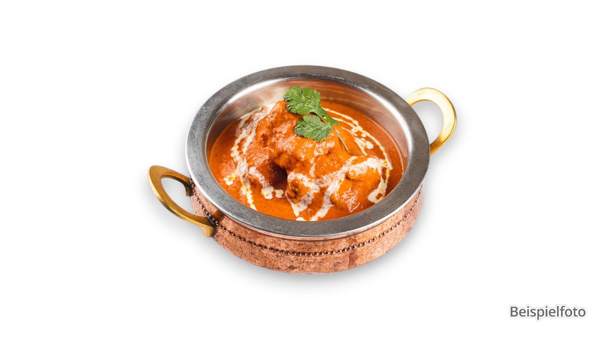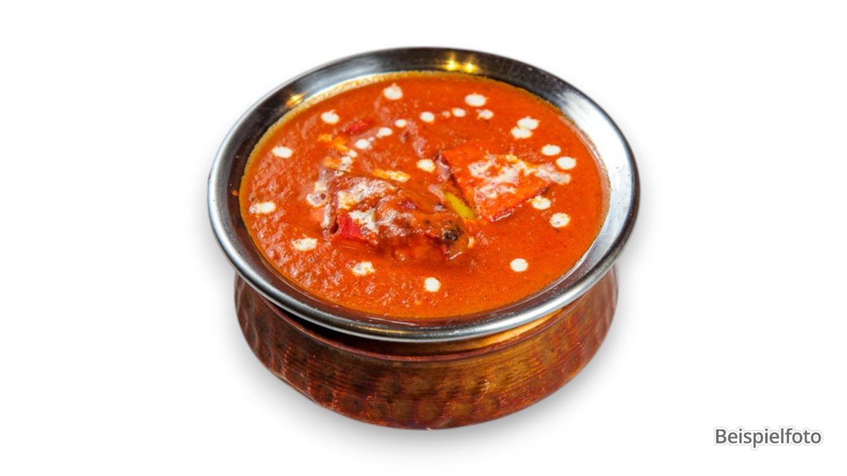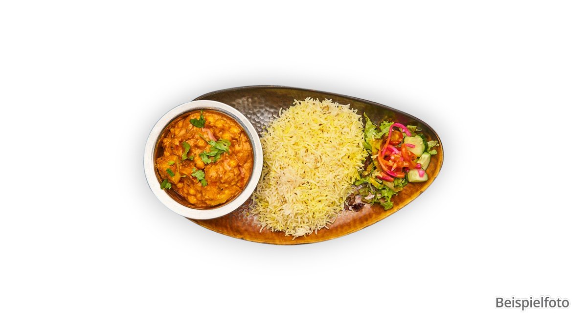 alle Gerichte werden mit Hähnchen und einem Schärfegrad deiner Wahl zubereitet und mit Reis serviert („Deshe Khana Tandoori Mixed Grill” wird ohne Hähnchen zubereitet und „Madras”, „Vindaloo”, „Jalfrezi”, „Garlic Chili” und „Tandoori Chili” sind scharf)