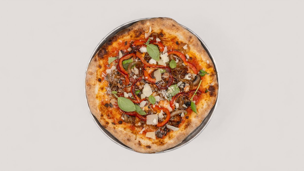 mit DOP San Marazano Tomatensauce, Fior di Latte Mozzarella, Röstzwiebeln, gerösteter roter Paprika, gerösteter Zucchini und Parmesan
