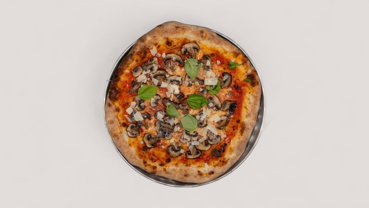 mit Fior di Latte Mozzarella, geschmorten Cremini & Shiitake Pilzen, Parmesan und Basilikum