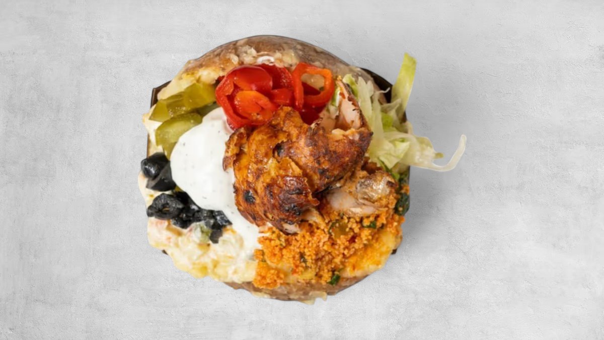 Döner (Hähnchen), Kisir (türkischer Bulgursalat), American Salad, Eisbergsalat, Oliven, Gewürzgurken, eingelegte Paprika & Soße deiner Wahl