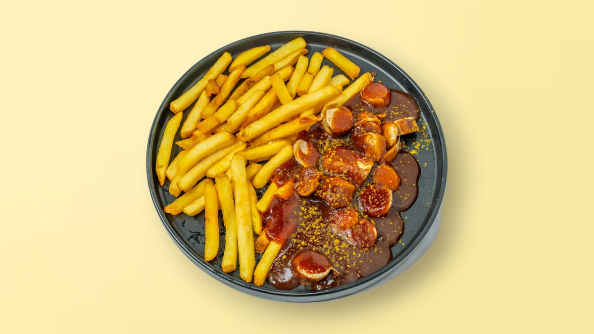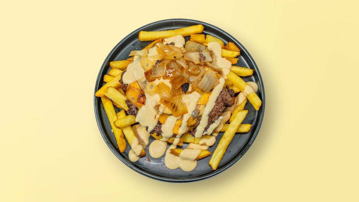 French fries with a beef patty, cheese, caramelized onions and Erkan's house sauce