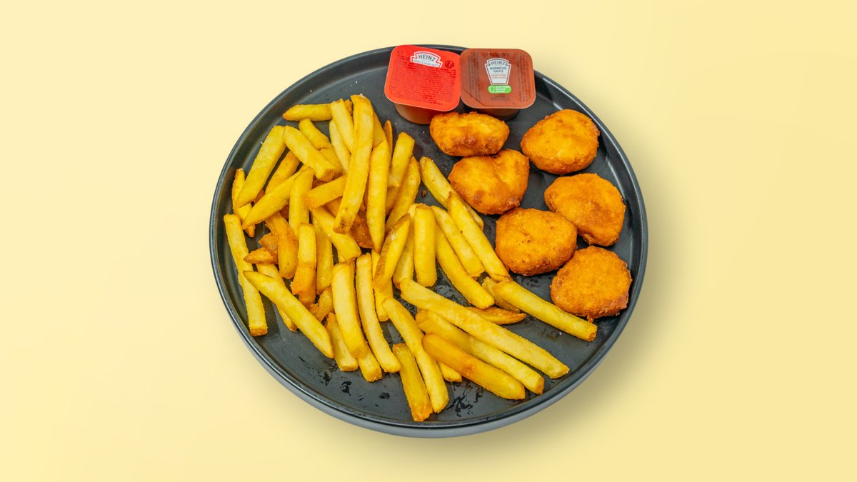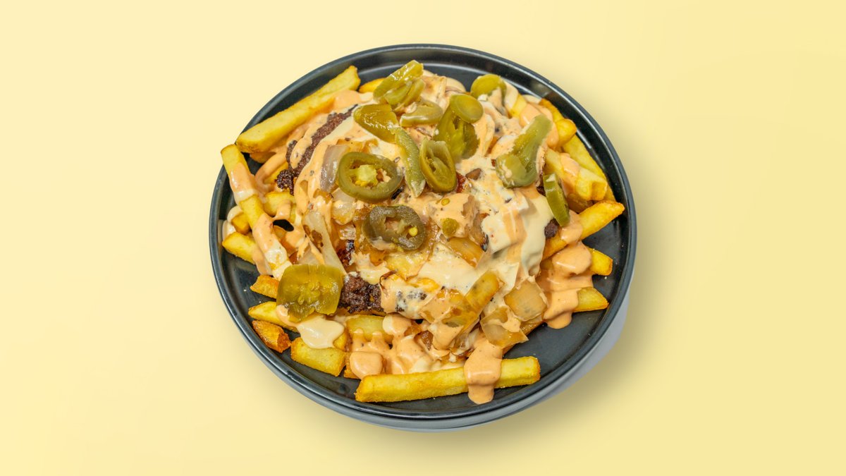 French fries with pieces of beef patty, melted cheese, jalapeños and chili sauce