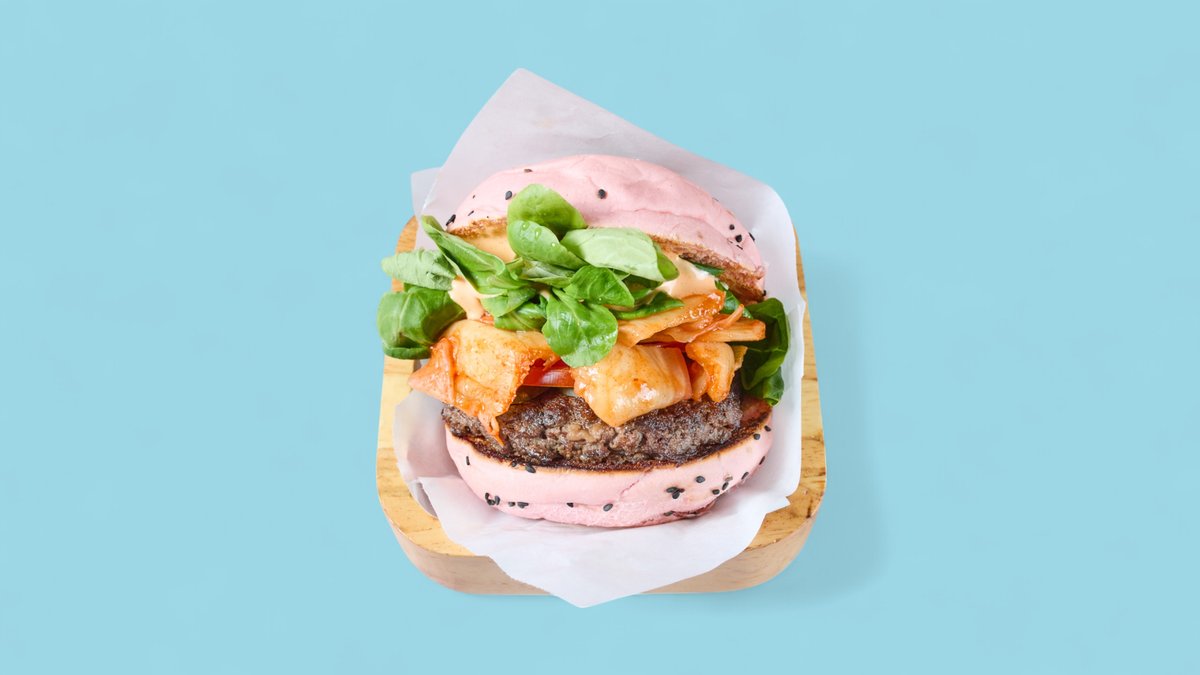 mit 120 g Angus Rindfleischpatty, Kimchi, Feldsalat, Gewürzgurken und Gochujang-Mayonnaise