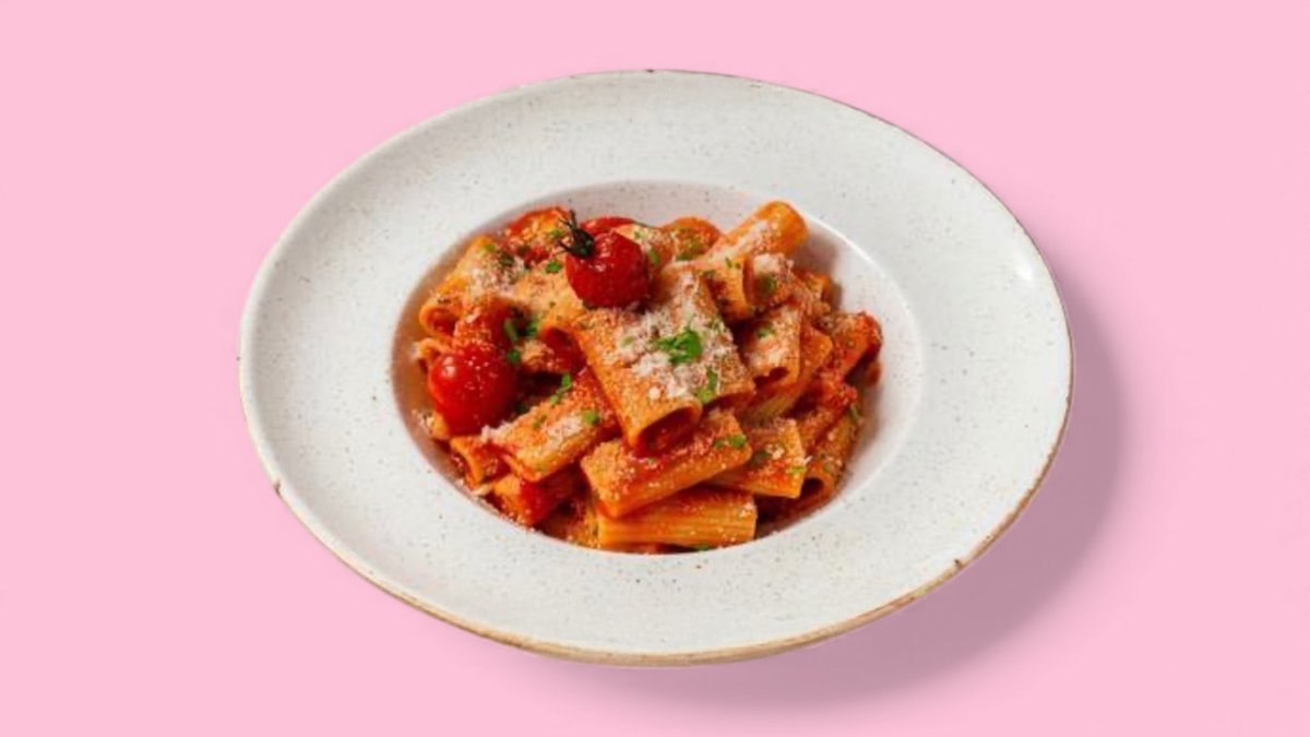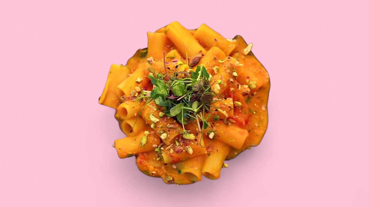 Rigatoni with pureed Hokkaido pumpkin, cherry tomatoes, pistachios and black garlic