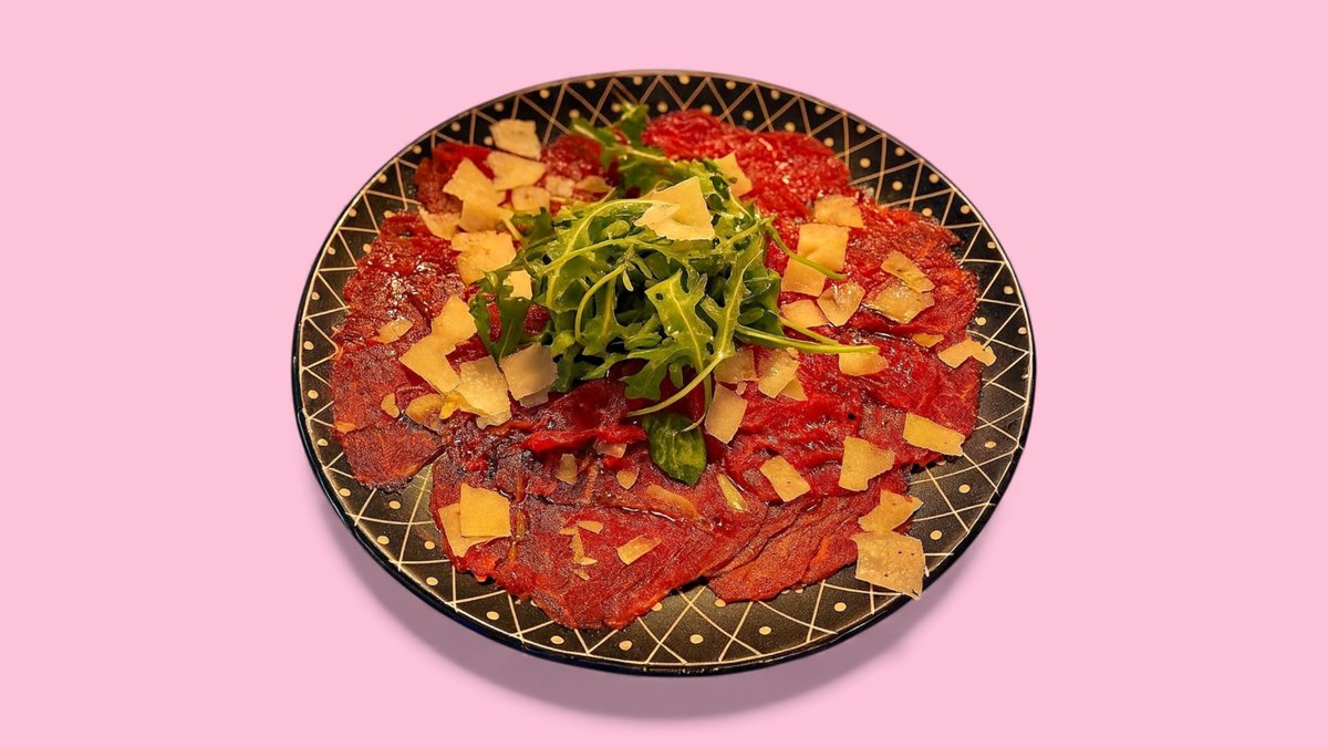 Finely sliced beef carpaccio with arugula, Parmesan cheese, olive oil and lemon