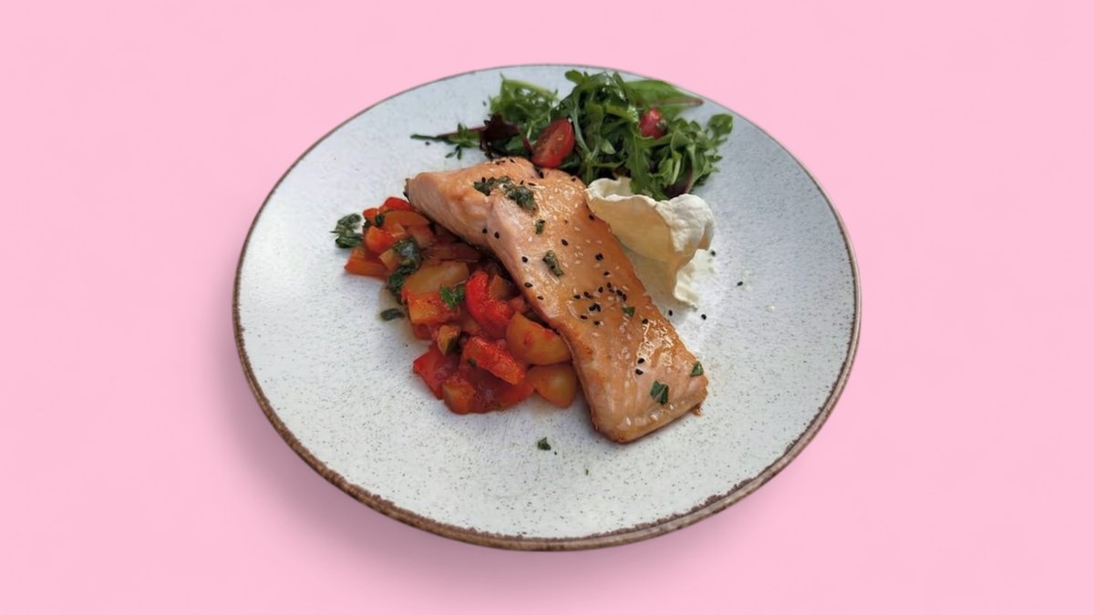 norwegian wild salmon with honey and mustard crust, caponata and colorful salad