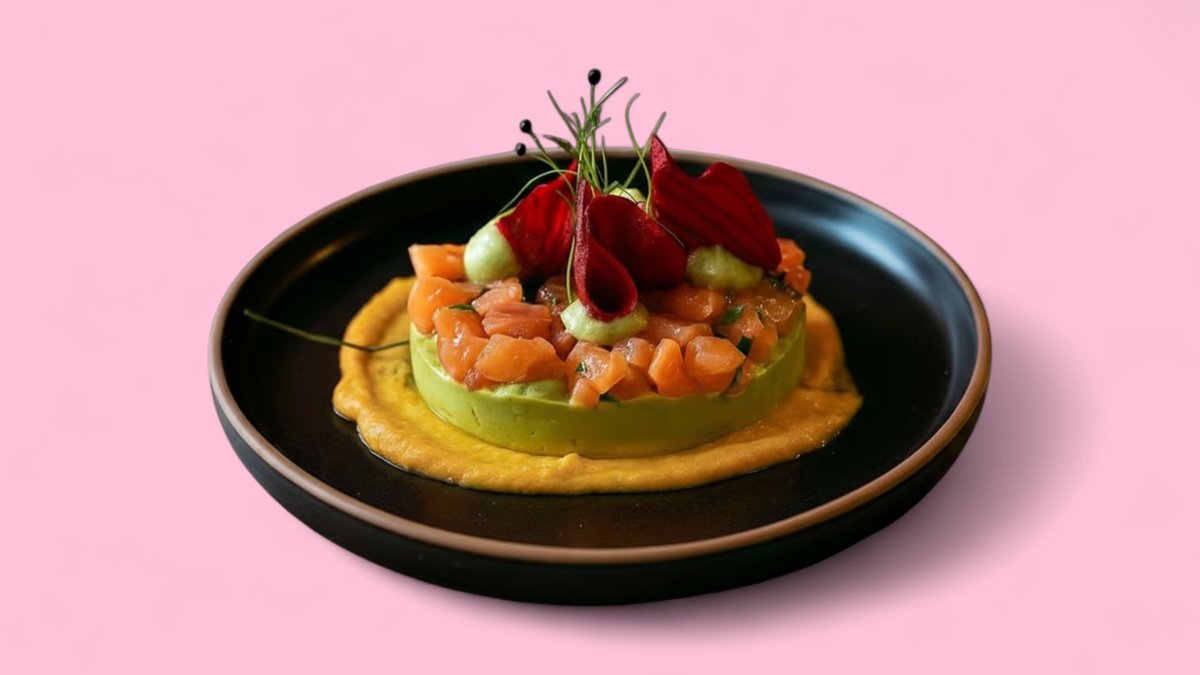 hand-cut salmon with avocado cream, pickled beets and sweet potato puree