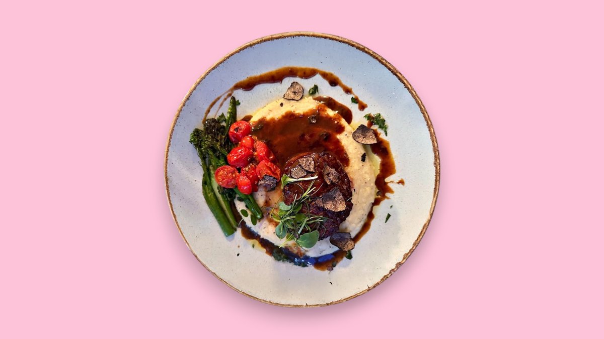with port wine jus, beetroot and celeriac puree and glazed wild broccoli Contains alcohol, not suitable for children and pregnant women.